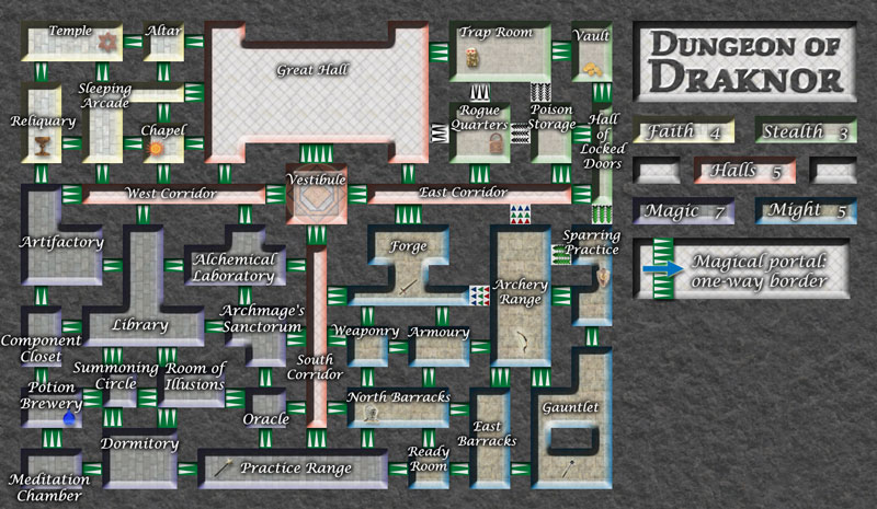 also, consider reversing the direction of the doors from East Corridor to Poison & Locked doors, that way you keep the number of entries/exits for Stealth, Locked doors only has one way out... mwah ha ha